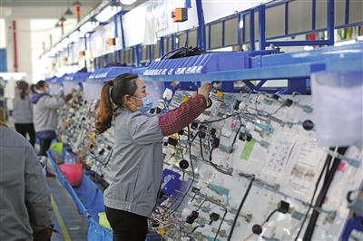 图为重庆民康电器生产车间,工人正在工位上忙碌。(代君君/摄)