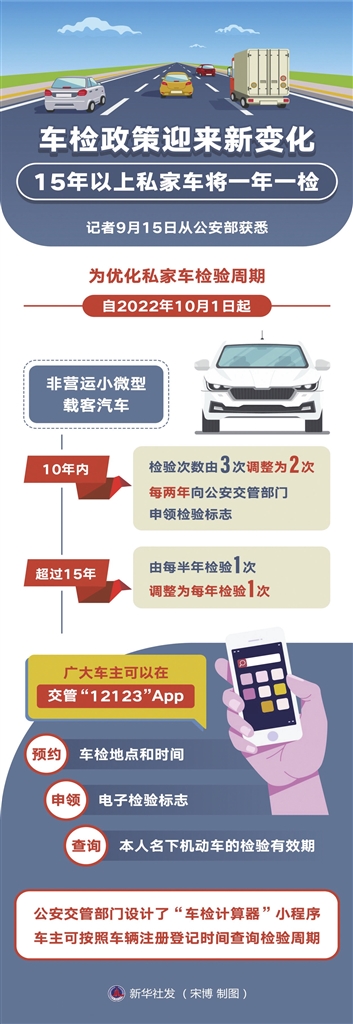 据新华社北京9月15日电 (记者 任沁沁)记者15日从公安部获悉,为优化私家车检验周期,自2022年10月1日起,10年内非营运小微型载客汽车,检验次数由3次调整为2次;超过15年的,由每半年检验1次调整为每年检验1次。