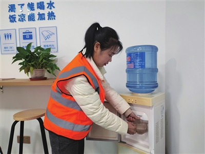 在位于人民广场和乌江三桥桥头的劳动者港湾,记者看到,占地十几平方米的小屋子内,桌椅、冰箱、微波炉、空调、医药箱等生活服务设备设施一应俱全,充满了浓浓的“人情味”。“这里可以热饭、可以喝水、可以充电、可以烤火,特别巴适!”正在休憩的环卫工人告诉记者,这里是他们工作闲暇时最温暖的歇脚地。