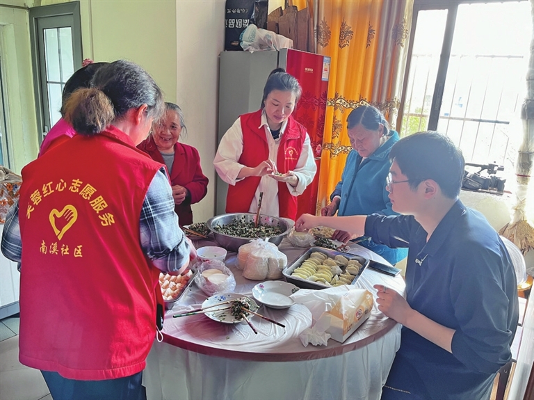 近日,芙蓉街道南溪社区志愿者来到社区空巢老人家中,与老人一起聊天、包饺子,吃团圆饭,用爱让老人感受到社区大家庭的温暖。 (王颖/摄)