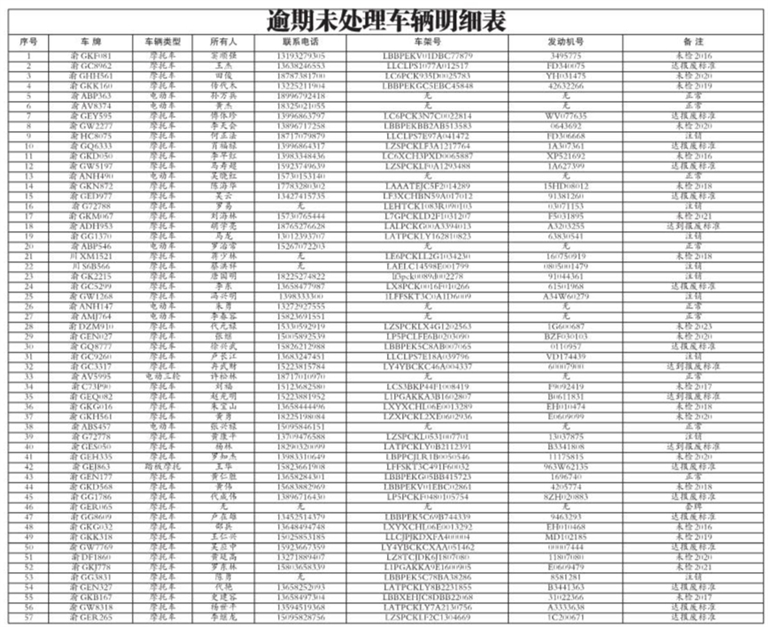 武隆区城市管理综合行政执法支队、武隆区公安局交通巡逻警察支队在综合执法过程中依法扣留了以下车辆(见附表),根据《中华人民共和国道路交通安全法》第一百一十二条第三款、《中华人民共和国道路交通安全法实施条例》第一百零七条和《道路交通安全违法行为处理程序规定》第三十八条之规定,请车辆驾驶人、所有人或管理人,自公告发布之日起,三个月内携带车辆合法证明、《公安交通管理行政强制措施凭证》等材料,到武隆区城市管理综合行政执法支队(武隆区凤山街道上油房沟)、武隆区公安局交通巡逻警察支队(武隆区芙蓉街道白杨路)接受处理。逾期不接受处理的,武隆区城市管理综合行政执法支队、武隆区公安局交通巡逻警察支队将对扣留的车辆依法处理。
