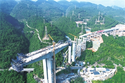 中咀乌江特大桥主桥是本标段的控制性工程,目前正在进行上部结构挂篮施工。在施工现场,记者看到,工人们正在进行底板钢筋绑扎、钢绞线下料、模板加固作业,现场一片热火朝天的施工景象。在中咀乌江特大桥施工中,中交二公局巴彭路8-5标先后克服了前期主墩大量房屋及高压线拆迁、复杂山区地形、雨季高温、工期紧等诸多困难,不断优化施工组织、狠抓施工安全质量管理,确保主桥施工进度有序推进。