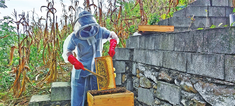 像李刚一样,在每年的盛花期带着蜂群前往白马山的蜂农还有很多。近年来,白马镇把中蜂产业作为全镇农业特色产业和推进乡村振兴的主导产业,通过扩大中蜂养殖规模,加强资源保护,强化技术推广,拓展营销渠道等方式,大力发展蜂蜜产业,让“甜蜜事业”成为当地乡村振兴的支柱产业。据统计,截至目前,白马镇已有蜂农500余户,年产蜂蜜60吨,产值近2000万元。