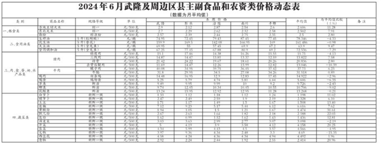 2024年6月武隆及周边区县主副食品和农资类价格动态表