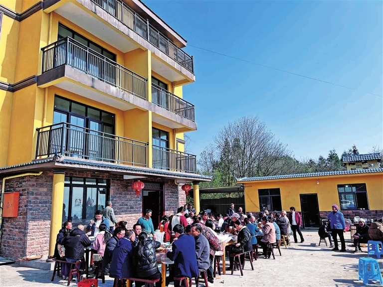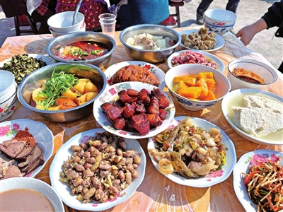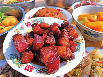 临近中午,红烧肉、萝卜炖排骨、回锅肉、粉蒸肉、血旺汤等经典菜肴相继上桌,每一道菜都充满了农家特色。居民们围坐在一起共品美食,开怀畅饮,拉拉家常,交流感情,整个场面温馨而热闹。