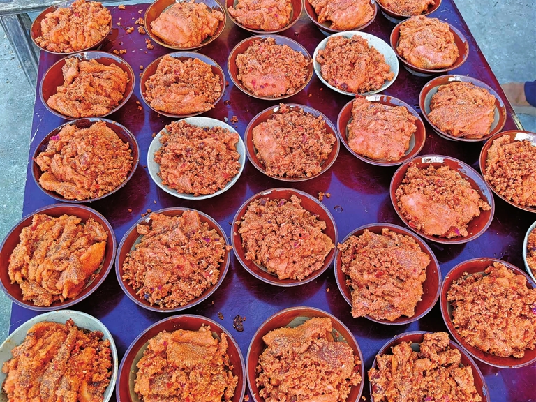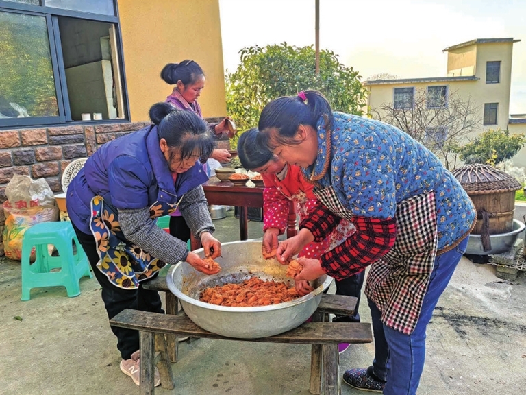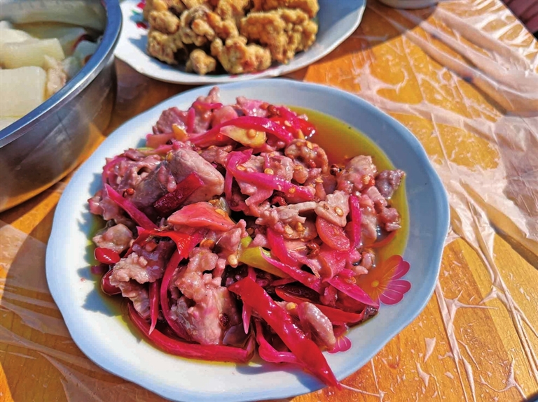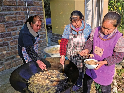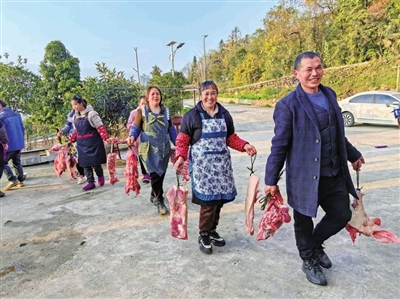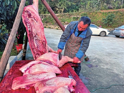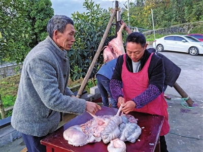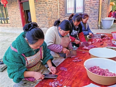 清晨,随着第一缕阳光的升起,居民们便开始忙碌起来。大家分工合作,默契配合,将刚刚宰杀的年猪清洗、脱毛、切块……现场一派繁忙的热闹景象。屋外在杀猪剔肉的同时,屋内也忙得不亦乐乎,乡邻们将新鲜的食材变成美味的佳肴,浓浓的年味儿洋溢着整个院子。