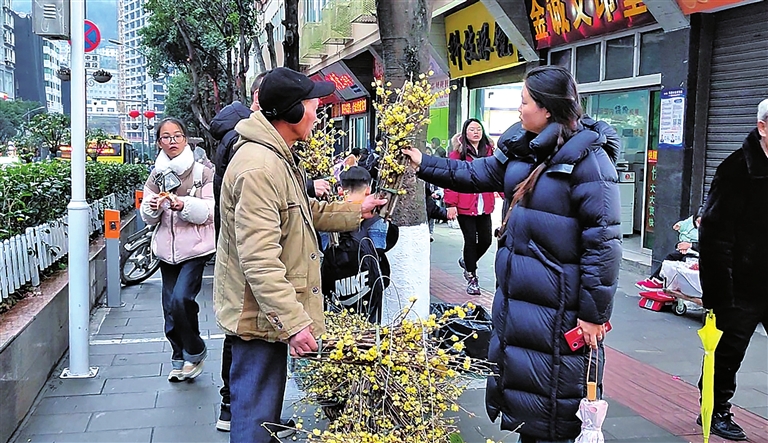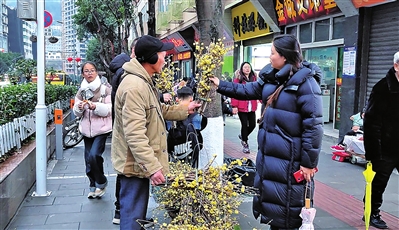 本报讯 (记者 陈思言)又到隆冬时节,腊梅凌寒绽放。近日,街头出现了不少或背着背篓或挑着扁担的卖花人,市民们争先前去买花,用芬芳美丽的腊梅花束为自己家的新春布置添香增色。