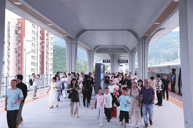 6月27日,载着300多名旅客的G8697次列车缓缓驶入武隆南站,这是渝厦高铁重庆段开通后,我区迎来的第一批乘坐高铁来武旅游的游客。