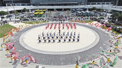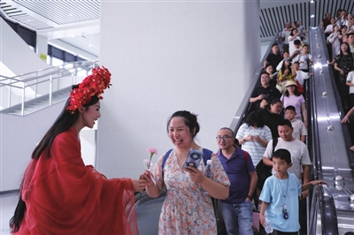 面向远道而来的游客,作为东道主的武隆为大家准备了热情的欢迎仪式。在武隆南站出站口,工作人员为游客贴心地送上鲜花、饮品,并提供周到的旅游服务。市民们则跳起了欢快的舞蹈,欢迎游客们的到来。