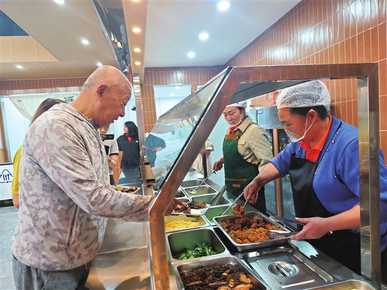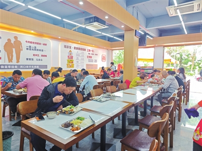 中午时分,位于仙女山街道香樟路56号的社区食堂内香气四溢、人潮涌动。宽敞明亮的大堂内,烧白、蒸蛋、土豆丝等12个荤素搭配、营养均衡的菜品整齐排列,不少居民们正在挑选喜欢的菜品。不一会儿,可容纳50余人的餐桌已经坐满了大半,大家津津有味地享受着丰盛美味的午餐。