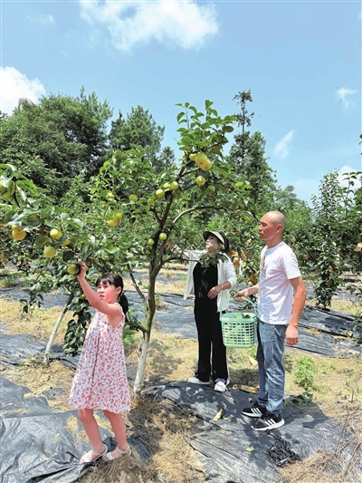 游客步入梨园,可亲手挑选枝头鲜果,感受丰收喜悦,园内还设有休憩纳凉区,特别适合家庭亲子出游、摄影打卡,在清凉山风中尽享甜蜜时光。
